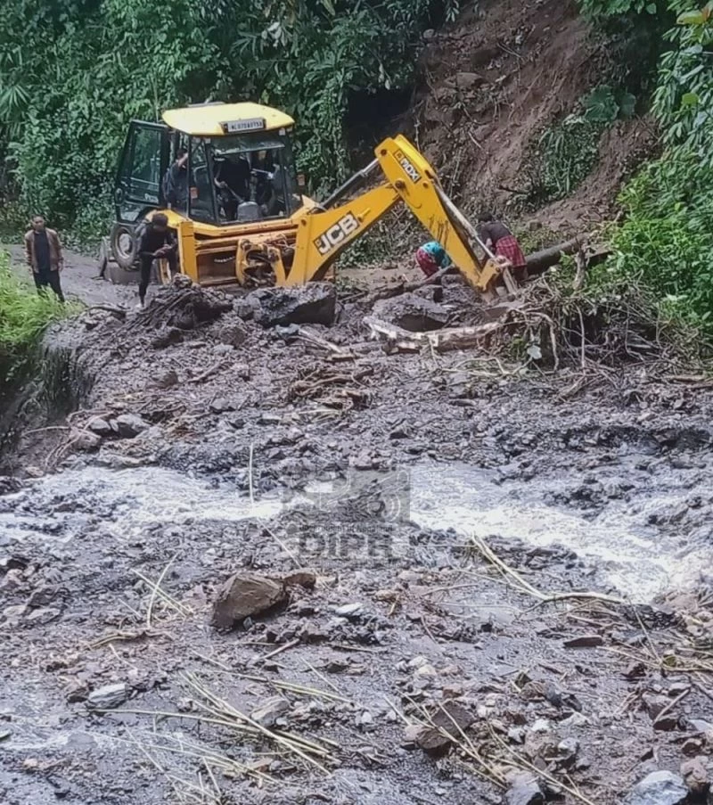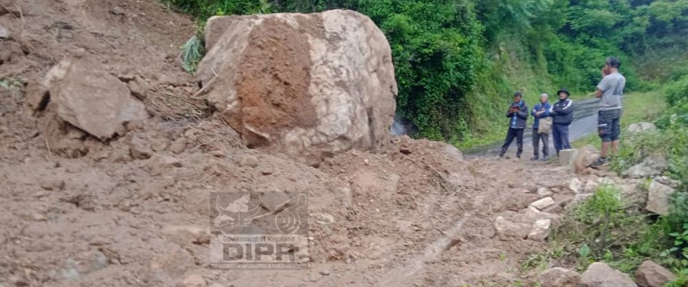 Road clearance effort between Penkim and Tsudang in Kiphire have been halted due to massive rock falls. Efforts are ongoing to make way for vehicles by the DDMA Kiphire in coordination with line departments on July 9. (DIPR Photo)