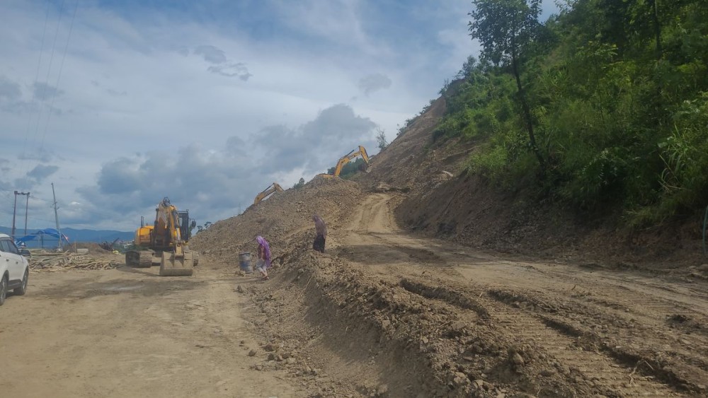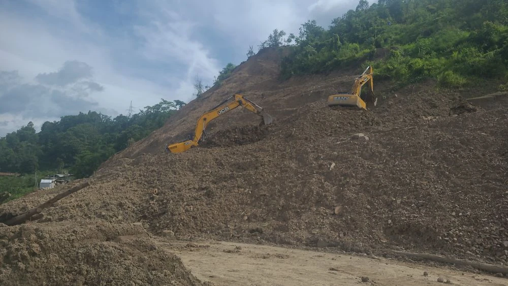 Restoration work underway on July 13 at the landslide-affected stretch of National Highway-2 at Phesama in Kohima district. The Southern Angami Public Organization (SAPO) had recently raised concern over the prolonged disruption, urging immediate action from NHIDCL and relevant authorities. (Morung Photo)