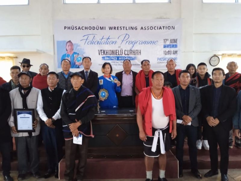 The Phiisachodiimi Wrestling Association (PWA) conducted a felicitation programme on June 17 for Vekhonielii Curhah, a bronze medalist of UWW Belt Wrestling Asian Championship 2023 held at Jizzakh, Uzbekistan. Phusachodumi Baptist Church pastor Rev Vevotso Theluo pronounced thanksgiving prayer while Nierun Theluo, advisor PWA delivered congratulatory message. The programme witnessed short speeches from Cusato Ruho, president PYS, Shenieta Curhah, president PSU, Ruyolii Medeo, chairperson PWS, Vethikhoyi Khamo, VDB secretary Phusachodu and Vehupa Rose, VCC Phusachodu. The programme was chaired by PWA president Mulekhoto Khamo and concluded with benediction by Zhopovelii Liipo-o, youth director PBC.