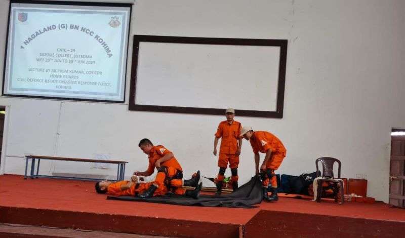 AK Prem Kumar, Inspector, Company Commander, Home Guards, Civil Defence and State Disaster Response Force alongwith D Angami of Nagaland Fire Department visited the NCC Camp and conducted an interactive lecture and demonstration for the cadets attending CATC-29 at Sazolie College, Jotsoma on June 28. The lecture and demonstration on Disaster Management conducted by the State Disaster Relief Force focused on the importance of executing an evacuation, rescue and fire fighting as a primary protective action, regardless of threat or hazard. A weapon display showcasing the Infantry Weapons to the cadets along with the capabilities of the weapons was shared by the soldiers of 1st Assam Rifles (Lushai Hills). (Photo Courtesy: PRO (Defence), Kohima & Imphal)