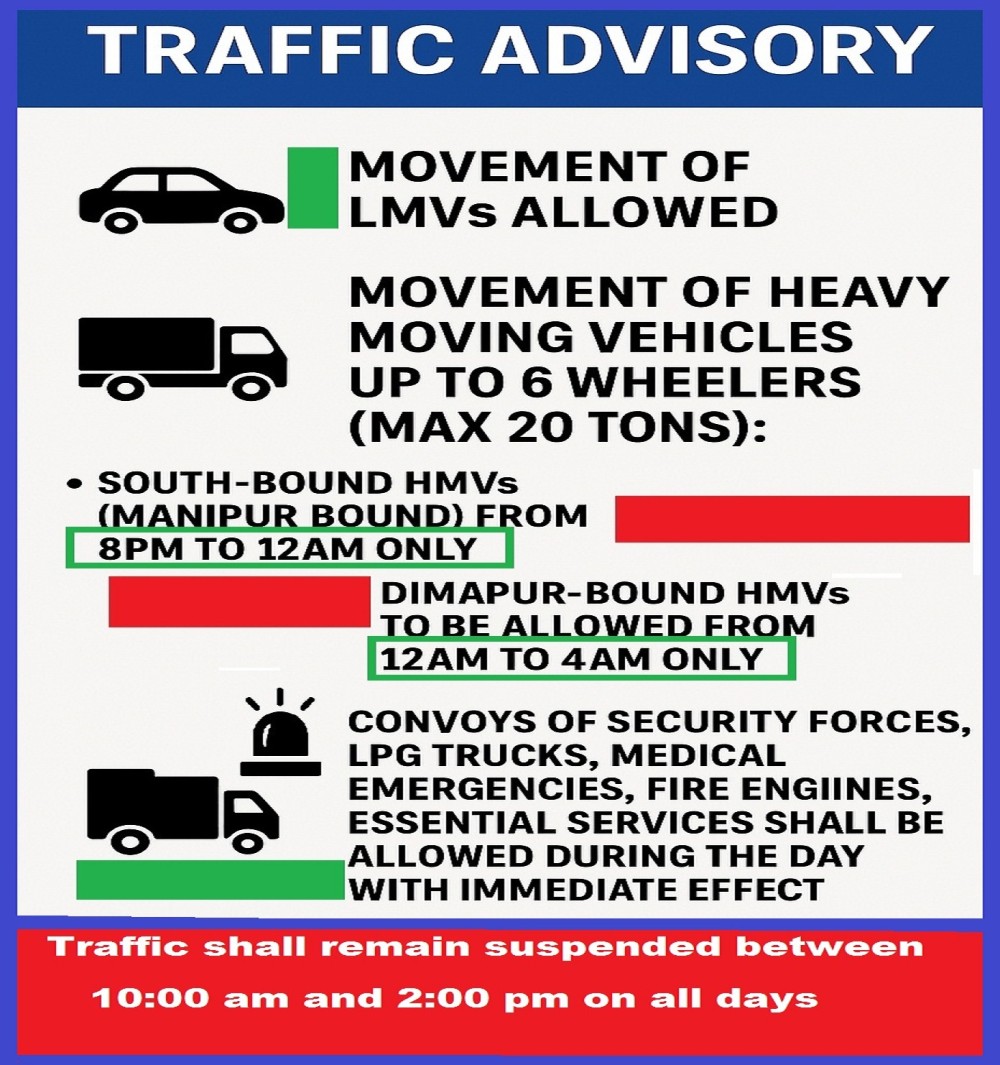 Kohima, September 3 (MExN): In view of the partial restoration of the affected stretch of National Highway-2 near Phesama, the Deputy Commissioner of Kohima has issued a detailed traffic advisory regulating the movement of vehicles along the Kohima–Mao route.