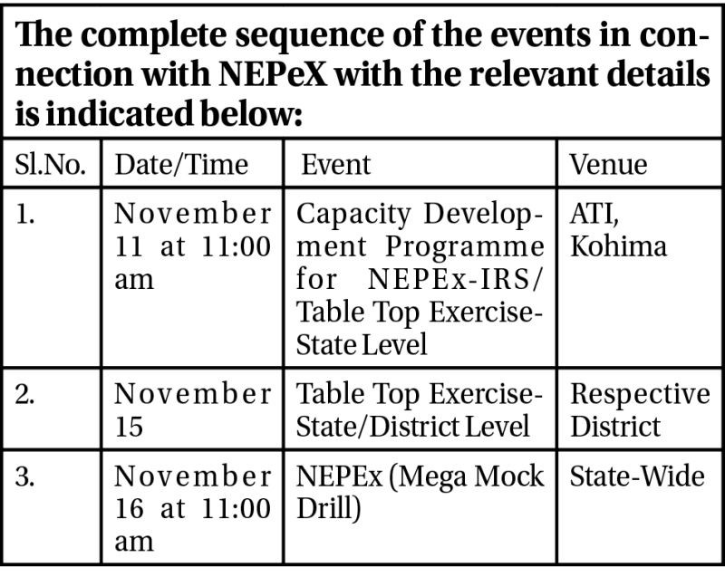 An update issued through the DIPR stated that as a precursor to the NEPEx, a capacity development programme for the same will be organised for the AHoDs/HoDs concerned and the DDMA officials on November 11, 2022 at ATI Kohima. The AHoDs/HoDs of all the departments concerned and two officials each from all the District Disaster Management Authorities are requested to make it convenient to participate in the programme.