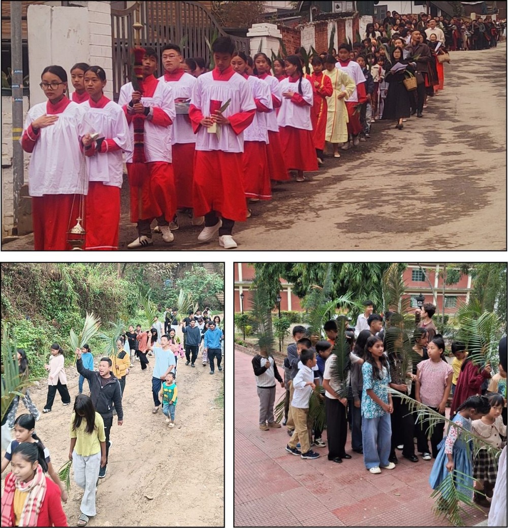 (From top, left and right) Believers take part in the processions during the Palm Sunday programme held at Christ the King Church Kohima Village, Athibung village and Patkai Christian College on March 29.