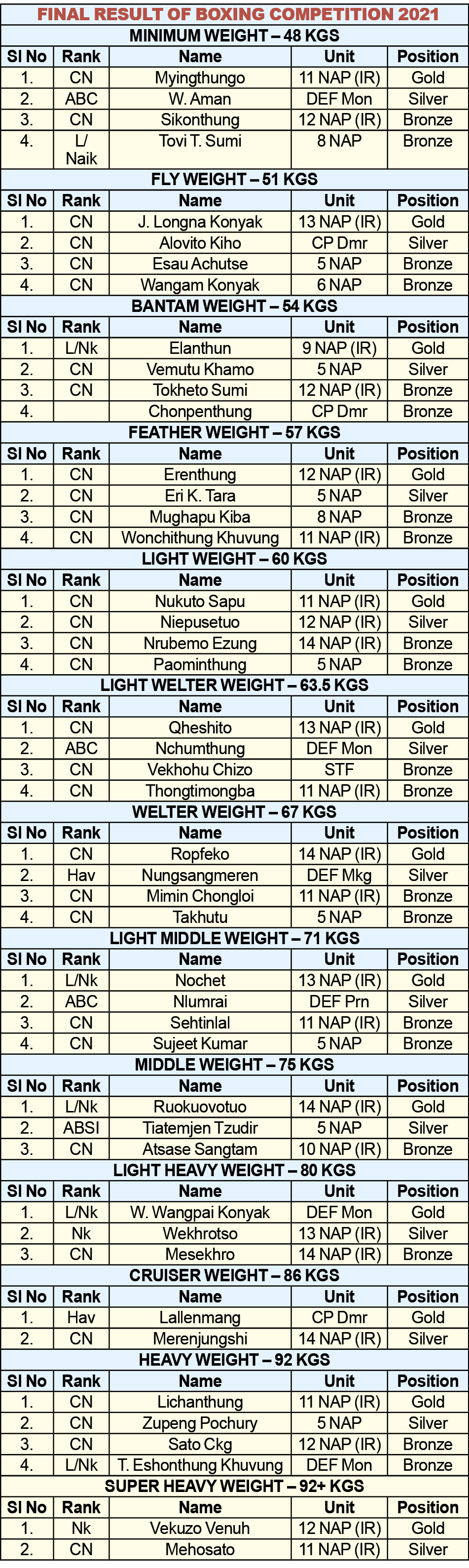 The penultimate day of the ongoing 39th Nagaland Police Duty-cum-Sports Meet 2021 on November 17 saw the highly popular and anticipated boxing finals, at the Nagaland Armed Police Training Centre (NAPTC) Stadium Chümoukedima.