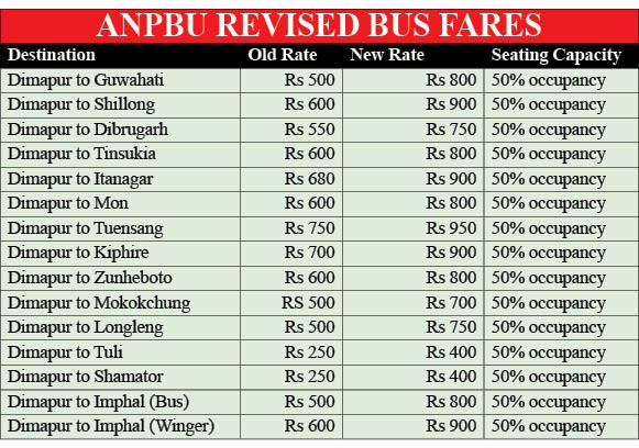 A statement the All Nagaland Private Bus Union (ANPBU) dated September 4 informed that the Union has been ‘compelled to enhance the route rate,’ in order to maintain social distancing in the vehicles.