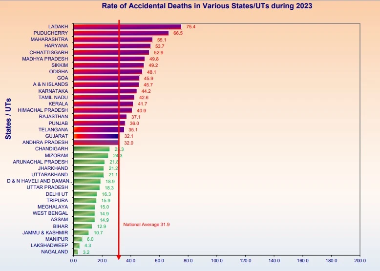 The highest rate of accidental deaths was recorded in Ladakh (75.4), followed by Puducherry (66.5) and Maharashtra (55.1).