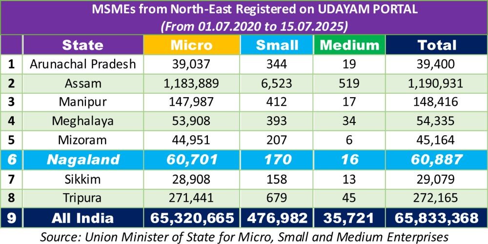 Nagaland and other North-East states have registered a significant number of Micro, Small and Medium Enterprises (MSMEs) on the Udyam Registration Portal (URP), according to data presented in Parliament.