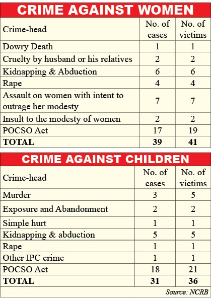 Of the 31 cases of crime against children, 18 were registered under the Protection of Children from Sexual Offences (POCSO) Act. There were 21 victims in the cases registered under the POCSO Act, out of which 19 were girls.