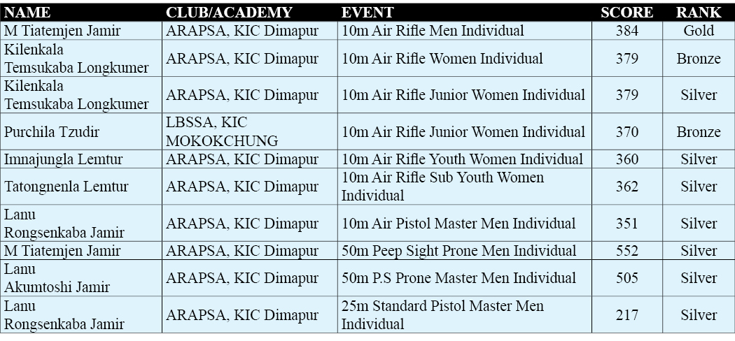 Altogether, 20 shooters from Nagaland participated at the Championship and achieved one Gold Medal, seven Silver Medals, and two Bronze Medals and stood 6th Rank at the medal tally.