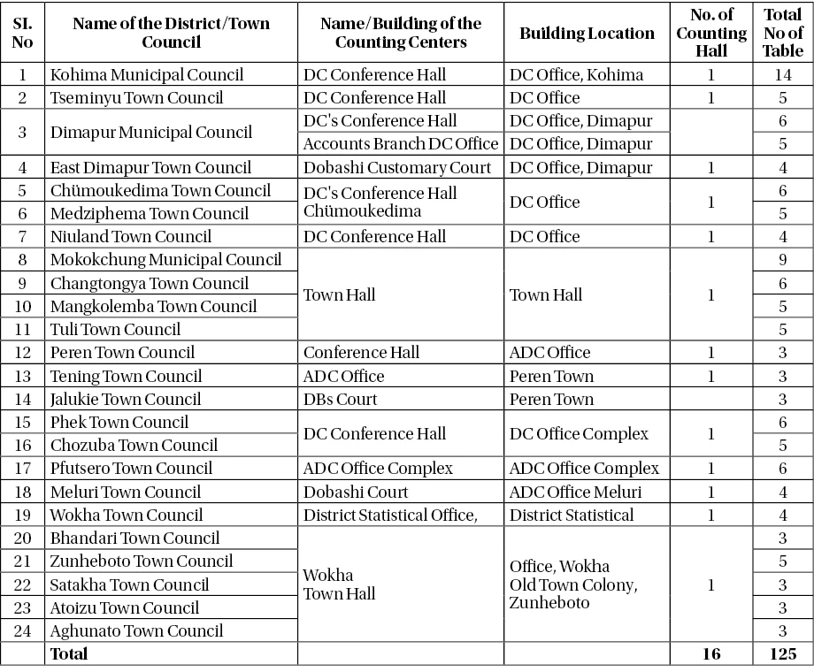 Kohima, June 21 (MExN): In pursuance of Rule 68 of the Nagaland Municipal Election Rules 2023 regarding setting up of Counting Centers for the General Election to Municipal and Town Councils, the State Election Commission has approved the proposed list of the Counting Centers/Hall and the number of Tables submitted by the concerned Districts/Municipalities.