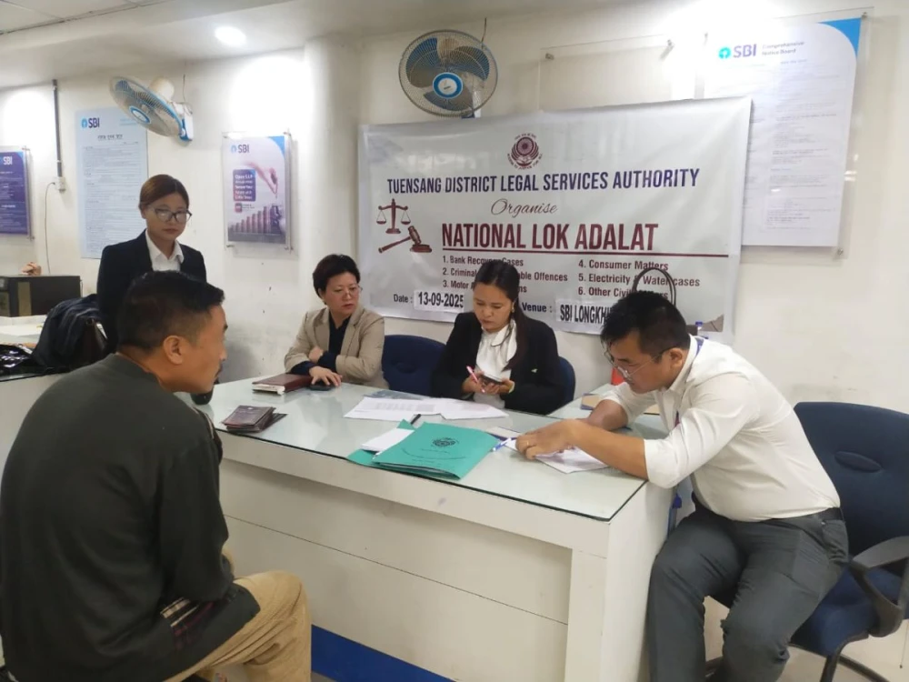 Mon DLSA conducted its Lok Adalat at the District Court Complex with District & Sessions Judge cum Chairman, Nokshei Kano, and Chief Judicial Magistrate cum Secretary, Wokono Yhoshii, as presiding officers. Panel lawyers acted as conciliators. Of the 39 pre-litigation bank recovery cases taken up, 11 were disposed of, with a settlement of Rs 17, 55,024. At Tuensang, the Lok Adalat was organised at SBI Longkhim, presided over by Principal District and Sessions Judge cum Chairman, Somet Chumden Chang, with Retainer Lawyer P. Herola and Panel Lawyer Ayangla as conciliators. Forty bank recovery cases were taken up, out of which 14 were disposed of, with a settlement of Rs 3, 69,900.