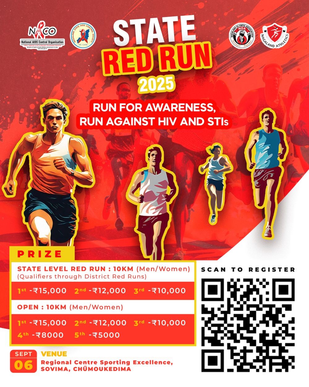 CHÜMOUKEDIMA, SEPTEMBER 3 (MExN): The Nagaland State AIDS Control Society (NSACS), in collaboration with the Nagaland Olympic Association (NOA) and Nagaland Athletics Association (NAA), will organise the State Red Run 2025 on September 6 at the Regional Centre for Sporting Excellence, Sovima, Chümoukedima. The event is being held under the aegis of the National AIDS Control Organisation (NACO), Ministry of Health and Family Welfare, Government of India.
