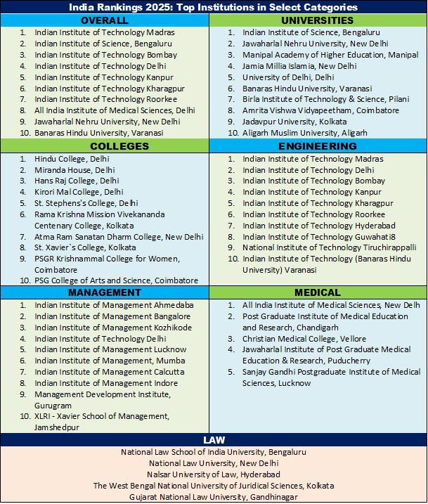 Among the highlights, the Indian Institute of Technology (IIT) Madras retained the top position in the Overall Category for the seventh consecutive year (2019–2025) and in Engineering for the tenth consecutive year (2016–2025). The Indian Institute of Science (IISc) Bengaluru and IIT Bombay followed in second and third place.