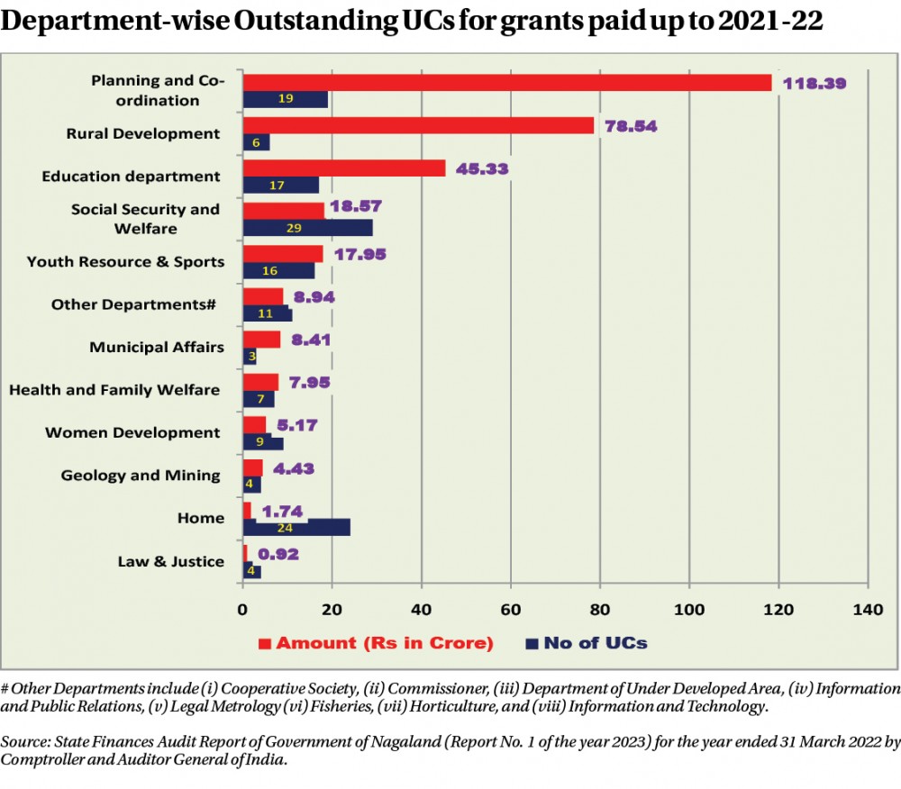 In addition, UCs of 61 grants involving Rs 81.80 crore provided to 16 Departments are due for submission during the year 2022-23, informed that CAG’s State Finances Audit Report, Government of Nagaland (Report No. 1 of the year 2023) for the year ended March 31, 2022.