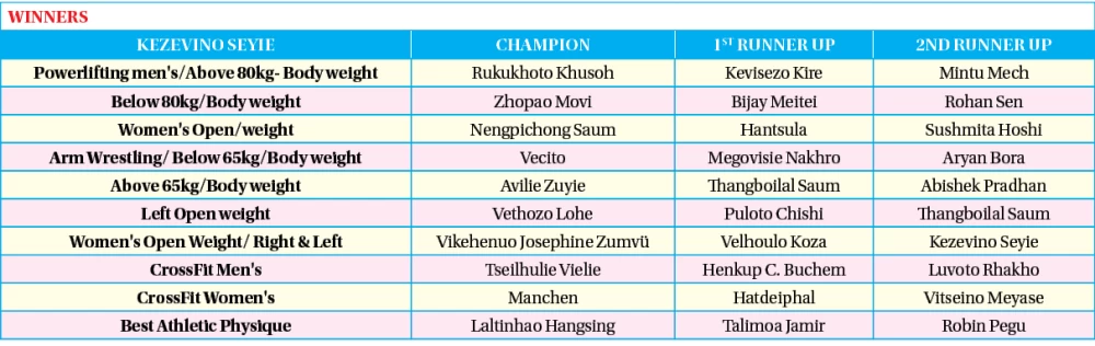 Seyievinuo Chuzho captivated the audience with her performance as a guest artist. Athletes from across Nagaland showcased their dedication and skills in various fitness disciplines, including Powerlifting, Cross Fit, Best Athletic Physique and Arm wrestling, captivating the spectators with their awe-inspiring performances.