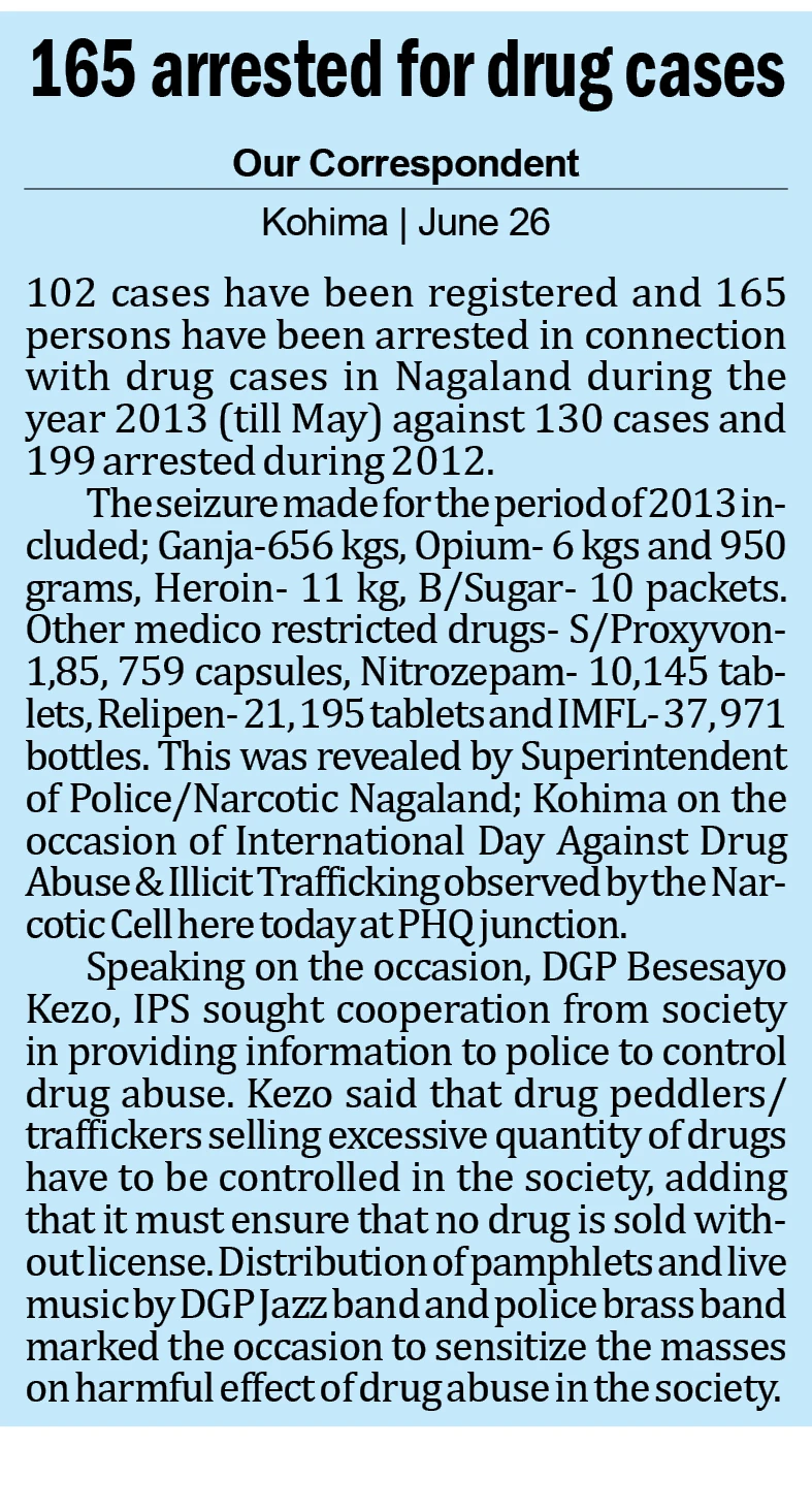 He appealed to all agencies and NGOs working towards eradicating the menace of drug trafficking to chart a “roadmap” with follow up action and a multi-pronged approach to combat the menace. District & session judge, S Hukato Swu, said the “potentiality of drugs” can cause a country or an empire to fall and cited the debilitating effect of opium on Chinese society and army just before the Opium war between China and Great Britain. Hukato said that drug is always interlinked with money, guns and violence. The session judge also informed that of the 21 drug cases he has disposed so far, 17 ended in convictions.