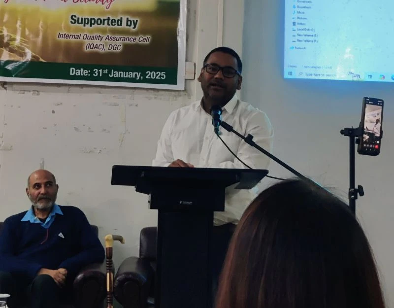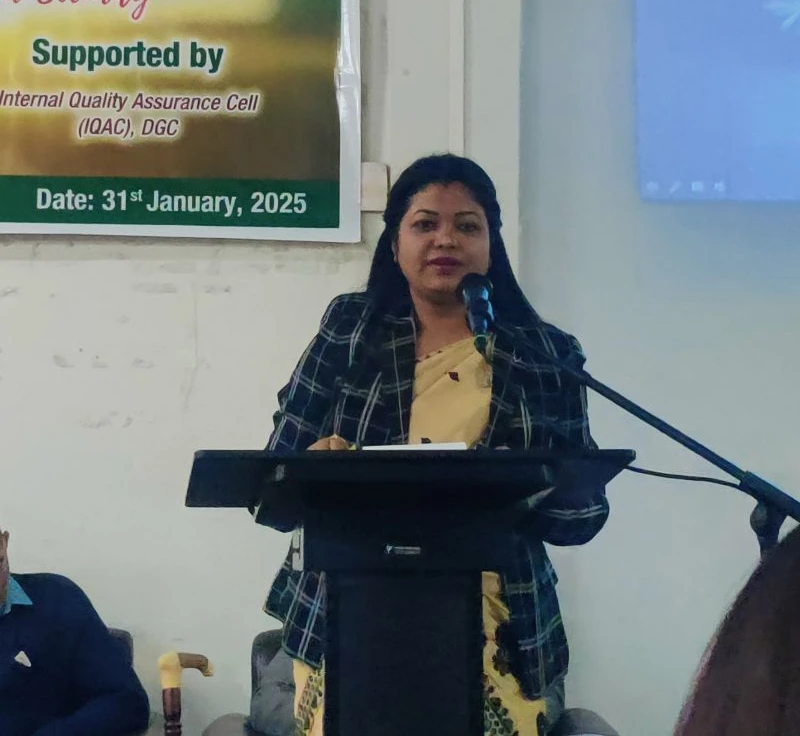 The seminar included two technical sessions. The first was chaired by Dr. Herali Achumi, Assistant Professor of Sociology, DGC. Dr. Rudra Narayan Bokakati, Scientist at the AICRP on Rapeseed and Mustard, AAU-Zonal Research Station, Shillongani, Assam Agricultural University, Nagaon, presented an online talk on Eco-Friendly Approaches to a Sustainable and Greener Future. A parallel offline session featured presentations from 14 research interns of DGC, mentored by their respective supervisors.