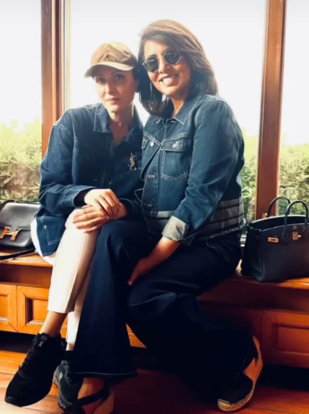 While both Neetu and Riddhima opted for denim jackets, the 'Jug Jugg Jeeyo' actress paired it with baggy denim trousers. On the other hand, Riddhima was seen posing in a white pair of pants. Both of them completed the look with comfy footwear.