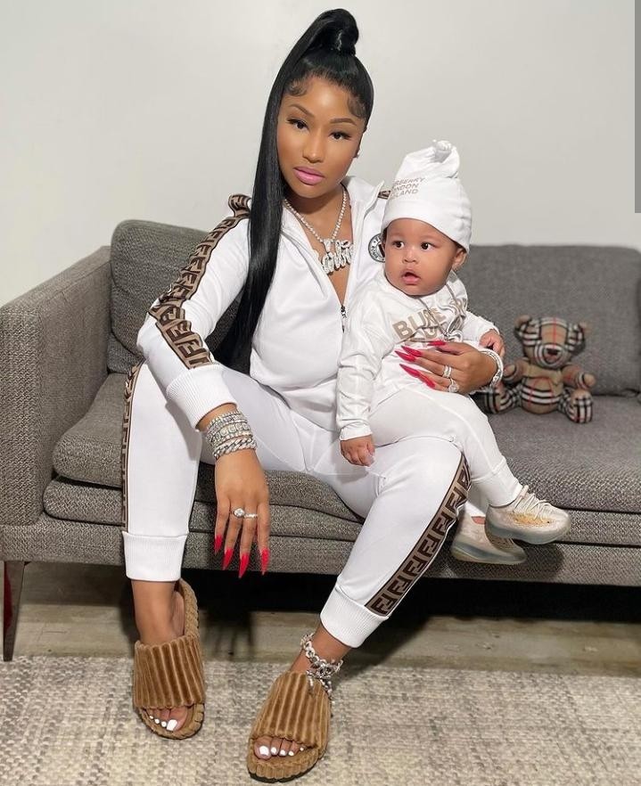 Nicki posted a set of pictures of herself posing on a couch on Saturday late night on Instagram. Only one photograph features her son.