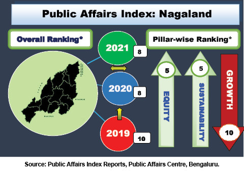 In the overall ranking, Nagaland, with an index score of -0.317, was placed 8th among the 11 small States. Manipur led from the bottom, followed by Uttarrakand, Delhi and Nagaland. Nagaland’s score in 2020 was -0.117.
