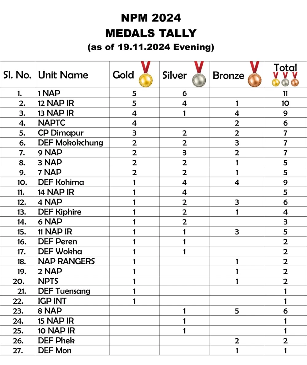 CHÜMOUKEDIMA, NOVEMBER 19 (MExN): The Nagaland Police Meet (NPM) 2024 is nearing its conclusion, with the penultimate day of the event seeing fierce competition. 2,029 participants from 34 different Units vied for 154 medals and 39 trophies across five sporting disciplines and ten duty items. All events have concluded, and results have now been declared, a press release issued by Convenor, Press & Media, NPM informed on Tuesday.