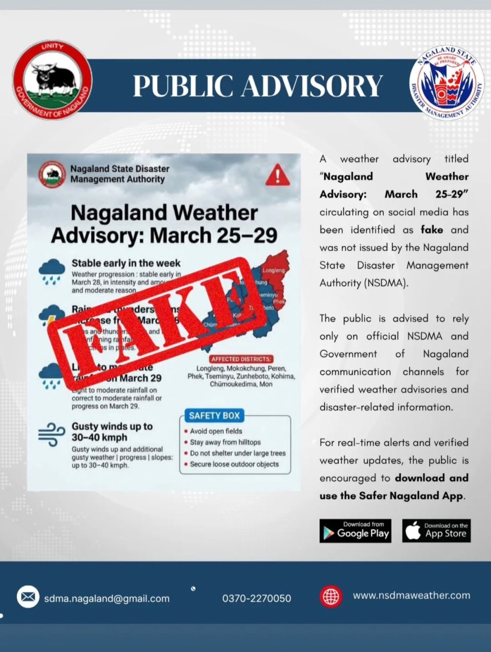 For accurate, real-time alerts and verified weather updates, the NSDMA has encouraged citizens to download and use the ‘Safer Nagaland App.’
