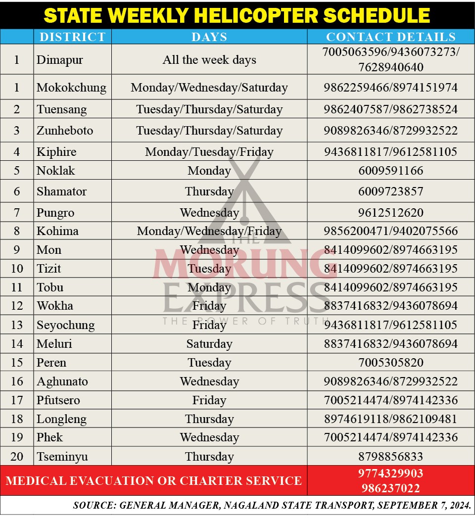 Dimapur, September 8 (MExN): The Nagaland State Transport (NST), on September 7, announced a new weekly schedule for State Helicopter service.