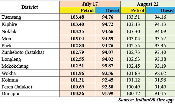 However, with marginal rises on August 22, three districts – Tuensang, Kiphire and Noklak showed slightly higher petrol prices than on July 17. In all other districts, the price of petrol was lower.