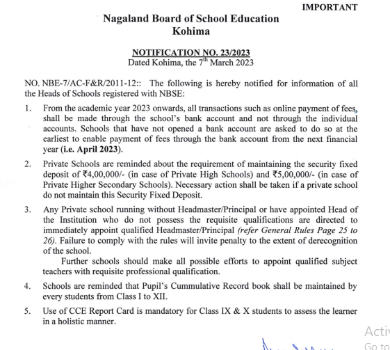 “From the academic year 2023 onwards, all transactions such as online payment of fees, shall be made through the school's bank account and not through the individual accounts,” stated a notification issued by Asano Sekhose, Chairman Nagaland Board of School Education (NBSE).