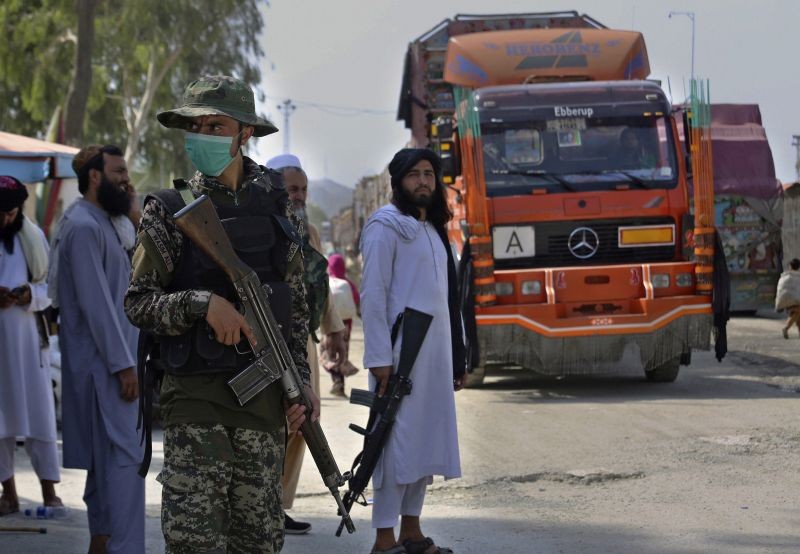 orkham: A Pakistani paramilitary soldier, front, and Taliban fighters stand guard on their respective sides while a truck moves to cross at a border crossing point between Pakistan and Afghanistan, in Torkham, in Khyber district, Pakistan, Saturday, Aug. 21, 2021. In the current situation of Afghanistan, pedestrian movement has limited in Torkham border, only stranded people in both sides and trucks taking goods to Afghanistan can passes through this border point. (AP/PTI Photo)