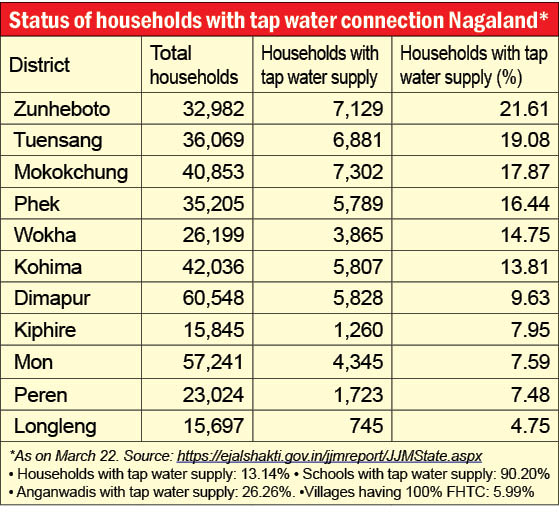 As of March 22, out of 3,980 in Nagaland only 1,045 had tap water supply denoting just 26.26%.