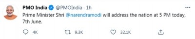 "Prime Minister Shri @narendramodi will address the nation at 5 PM today, 7th June," the Prime Minister's Office said on Twitter.
