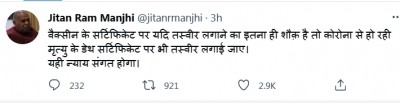 "Prime Minister is taking credit for corona vaccination in the country, his photograph should also be printed on death certificates of those patients who died due to corona in the country. It will be the real justification," Manjhi tweeted on Monday.