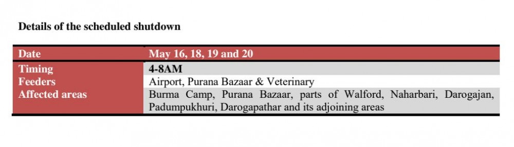 Dimapur, May 15 (MExN): Several localities in Dimapur district are expected to experience power shutdown in the morning with the power department affecting a scheduled shutdown between May 16 and May 20. Accordingly, the power supply from 11kV Airport, Purana Bazaar & Veterinary Feeders will be affected on May 16, 18, 19 and 20, from 4-8AM, informed a notification from Er Chubatemsu Ao, Sub-Divisional Officer, Electrical Sub- Division No.-II, Dimapur. The affected areas are Burma Camp, Purana Bazaar as well as parts of Walford, Naharbari, Darogajan, Padumpukhuri, Darogapathar and its adjoining areas. The shutdown is being done for construction of 11kV Trunk line to strengthen the 11kV feeders along main roads in Dimapur Town, the notification added, requesting the public in the affected areas to extend cooperation and bear the inconvenience during the shutdown period.