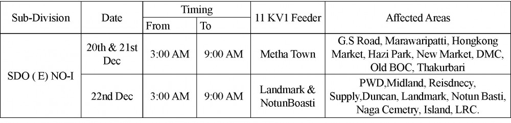 DIMAPUR, DECEMBER 19 (MExN): In view of dismantling and shifting of old existing HT and LT lines to newly erected Trunk Line in Dimapur town area, the Power Department will take power shutdown from December 20 to 22 from 3:00 AM to 8:00 AM. The schedule of the shutdown, as informed by the Power Department, through a press release is as follows: