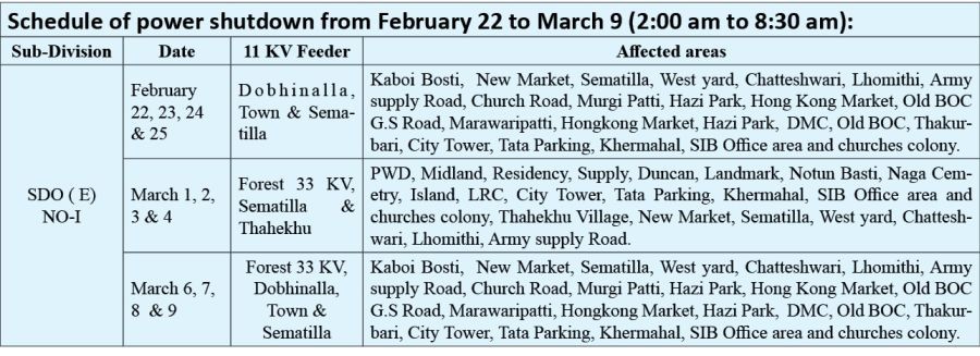 Dimapur, February 21 (MExN): In view of dismantling and shifting of old existing HT and LT lines to newly erected Trunk Line in Dimapur town area, the Power Department will take power shutdown from February 22 to March 9 from 2:00 am to 8:30 am.