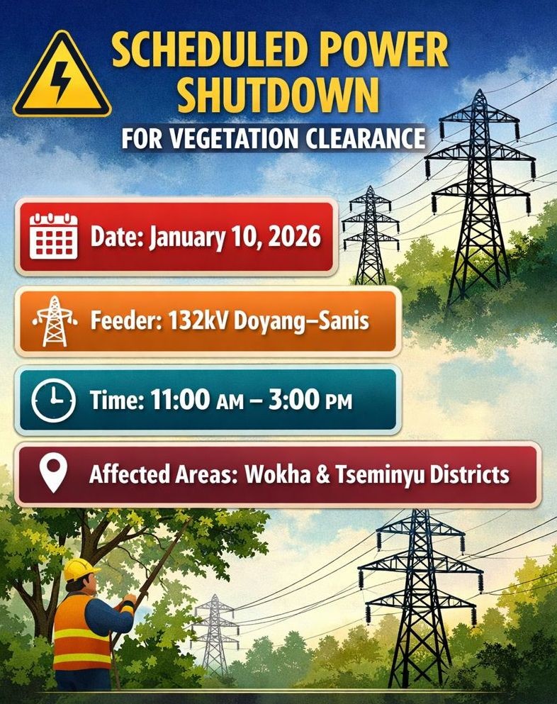 Kohima, January 9 (MExN): Power supply to Wokha and Tseminyu districts will be affected on January 10 due to a scheduled vegetation clearance and maintenance programme along the 132kV Doyang–Sanis transmission line under the Kohima Transmission Division.