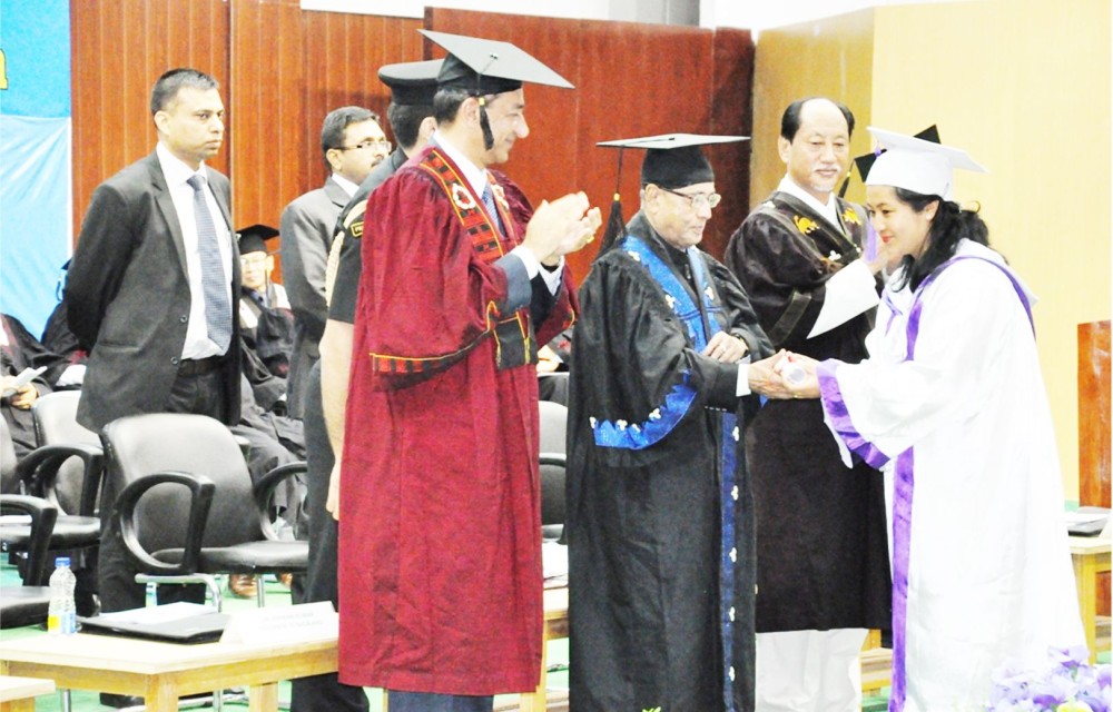President, Pranab Mukherjee handing a PhD award to one of the successful candidates during the 3rd Nagaland University Convocation at Lumami on May 15.