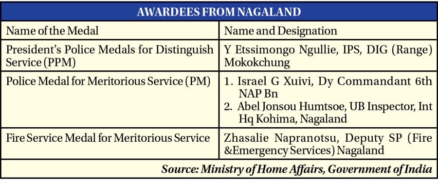 Among the police personnel from Nagaland, Etssimongo Ngullie, IPS, DIG (Range) Mokokchung received the top honour, the President's Police Medal for Distinguished Service (PPM) for 'special distinguished record in Police Service.'