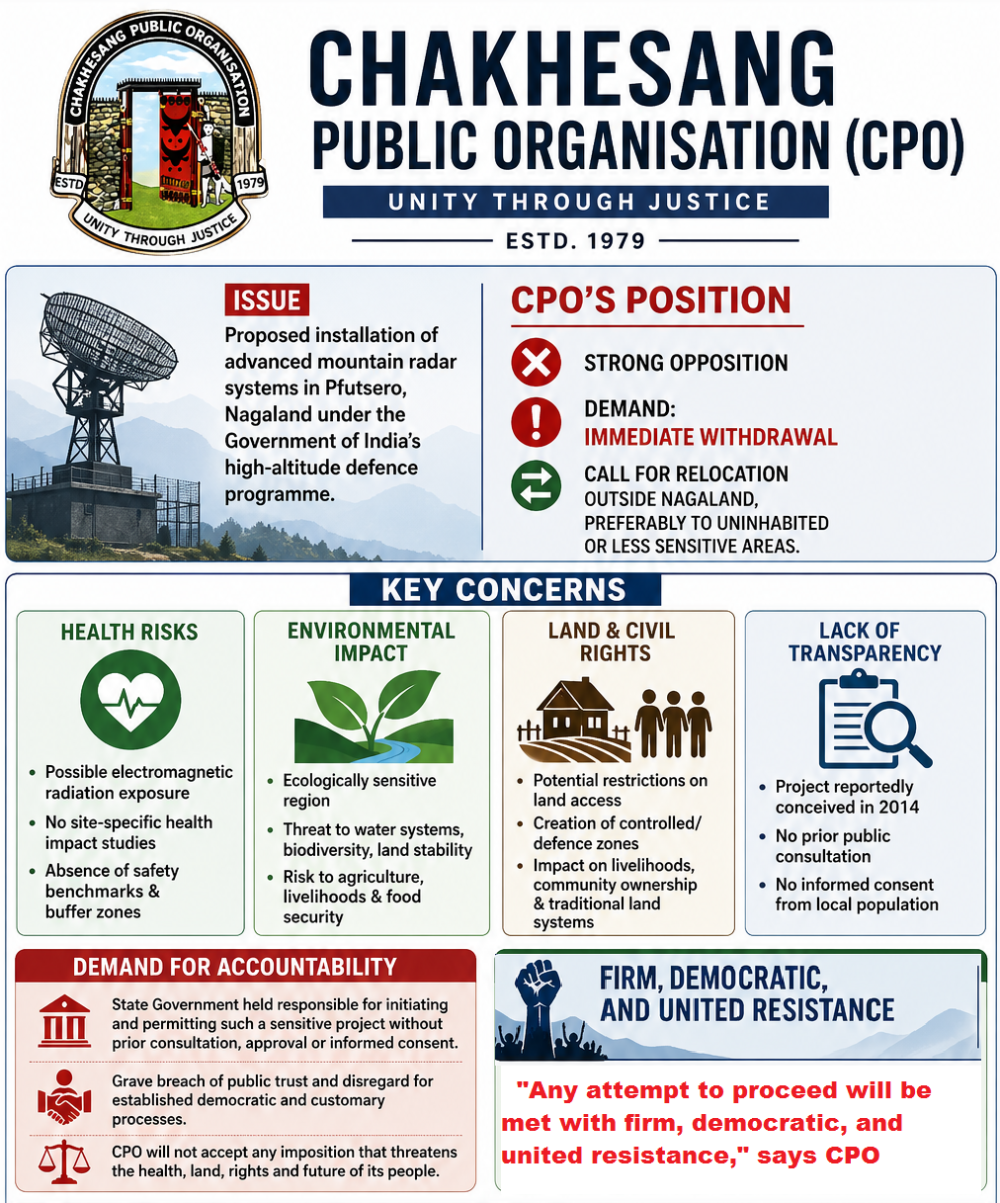The CPO also stated that the proposed deployment of high-powered radar systems raises serious concerns regarding electromagnetic radiation exposure, particularly in a high-altitude and densely inhabited area like Pfutsero.
