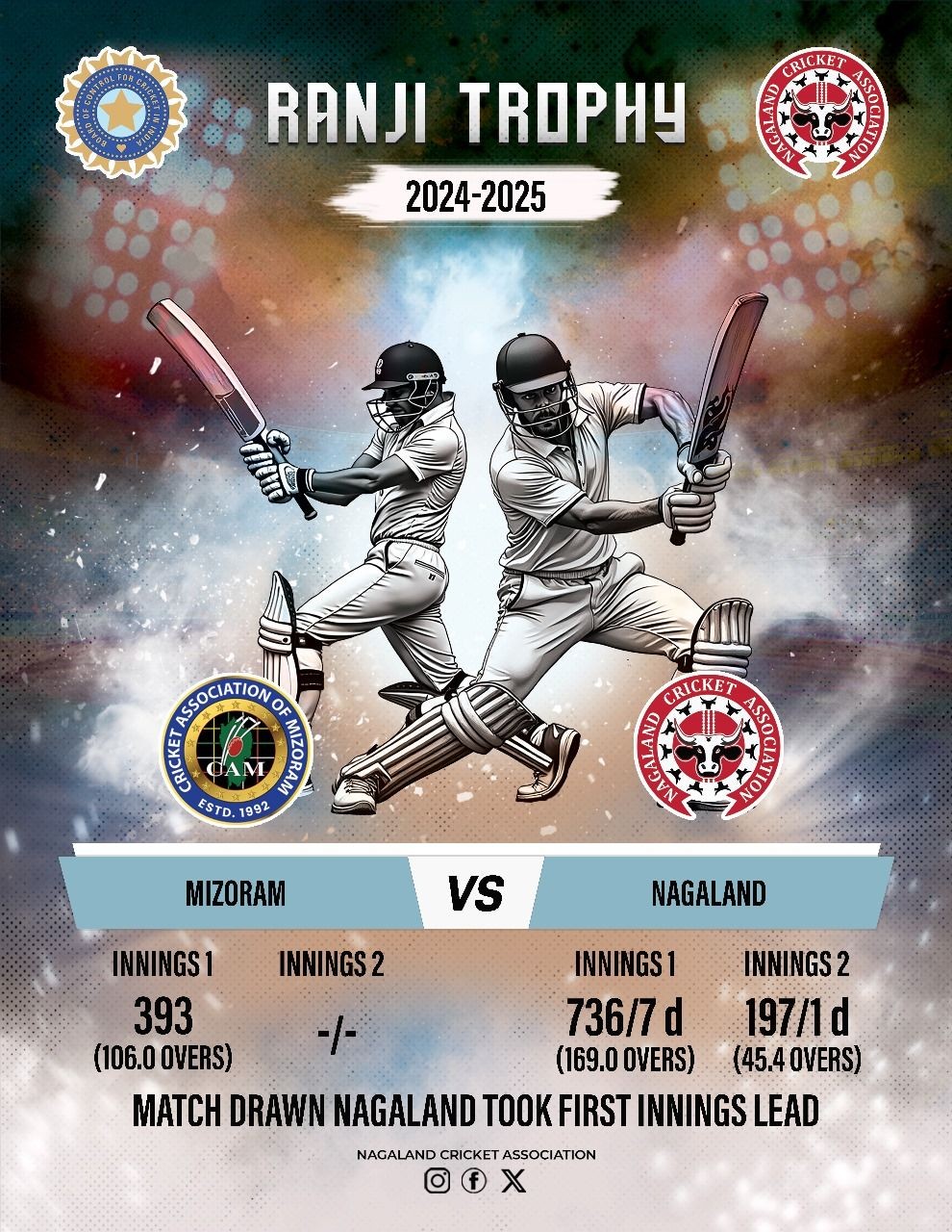 Batting first, Nagaland posted a monumental total of 736/7 before declaring their first innings. Chetan Bist’s record-breaking performance anchored the innings, while Nischal Dega contributed a brilliant 145 runs.