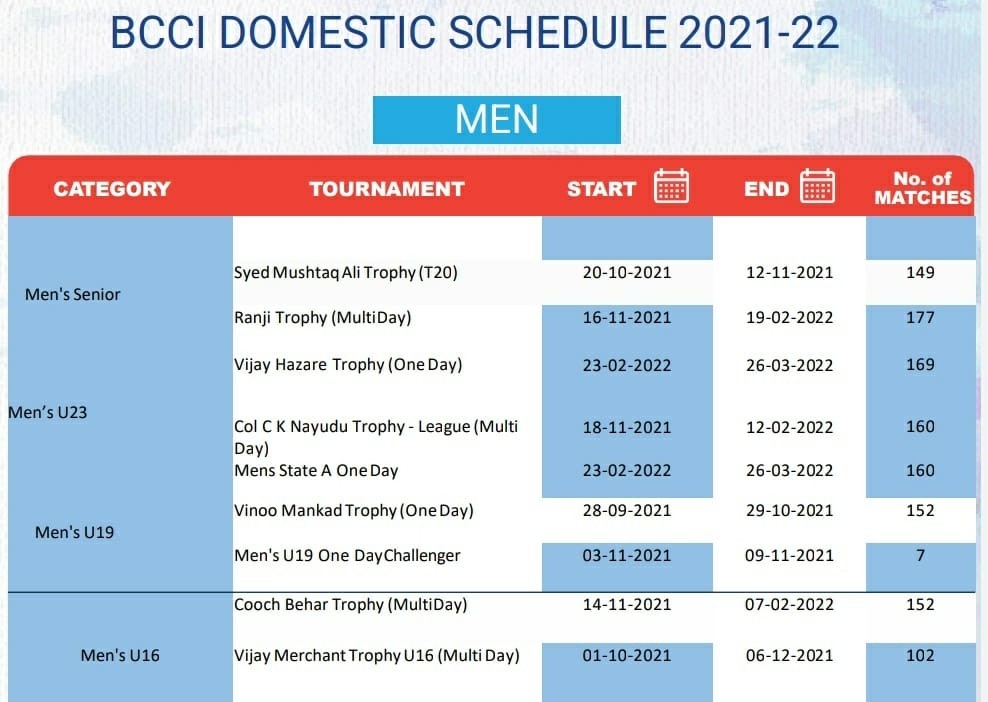New Delhi, July 3 (IANS): The Indian men's domestic cricket season, also including Ranji Trophy which was cancelled last season due to Covid-19 pandemic, will commence on October 20 and run till March 26, 2022. The multi-day Ranji Trophy will be played in a three-month window from November 16, 2021 to February 19, 2022, the Indian cricket board announced on Saturday.