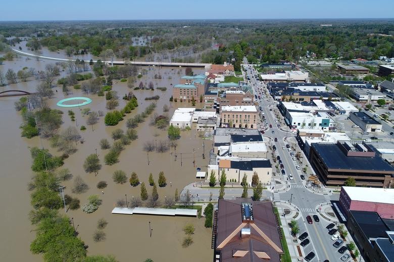 Rising flood waters of the Tittabawassee River advance upon the city after the breach of two dams, Edenville and Sanford, in Midland, Michigan. REUTERS/Drone Base