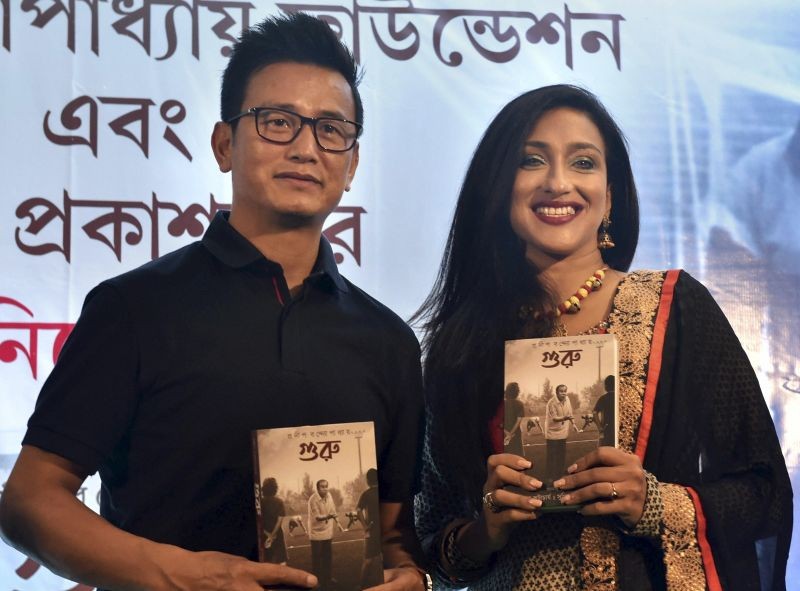 Kolkata: Actress Rituparna Sengupta with former Indian soccer player Bhaichung Bhutia during the book launch of legendary footballer P.K. Banerjee, in Kolkata, Sunday, Aug 8, 2021. (PTI Photo)