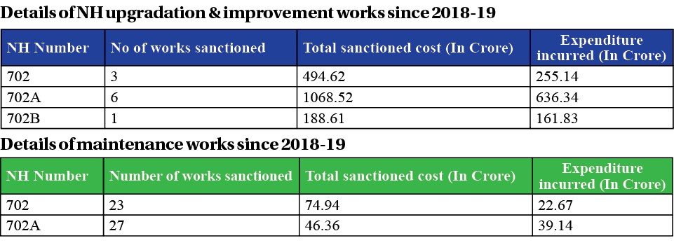 He further stated that no expenditure has been made on NH-702B by the ministry since its declaration; however, the Ministry of Development of North Eastern Region (DONER) sanctioned a work upgradation of this NH on August 5, 2019, which is in progress.