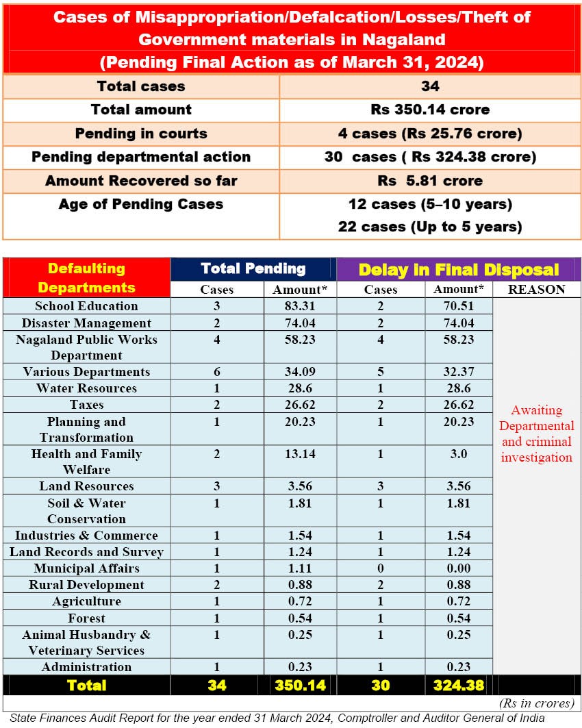 At the end of March 2024, Nagaland had 34 cases of misappropriation, losses, and theft of government funds and property worth Rs 350.14 crore pending final action, according to the Comptroller and Auditor General of India (CAG).