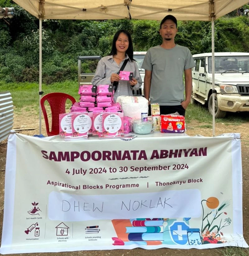 Under the DHEW Department, in collaboration with Boditive India, Nagaland's first sanitary pad brand, sanitary pads were distributed to the adolescent girls in Peshu village. The main highlights of the stalls were the food prepared by Anganwadi workers which included Millet cake, rice popcorns, Job’s tear millet rice water and baskets made of corn seeds by SHGs of Peshu Village.