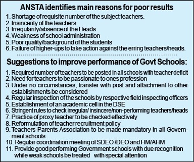 While stating that many factors can be attributed for the poor performance of Government Schools, the observations/findings of the ANSTA have identified what it termed as the main causative factors responsible for the poor results of Government Schools in the HSLC Examination (See box).