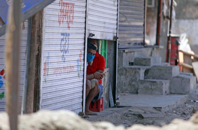 People wearing protective face mask seen sitting inside a half-open shop, amid nationwide lockdown, in Mumbai on Friday. (ANI Photo)