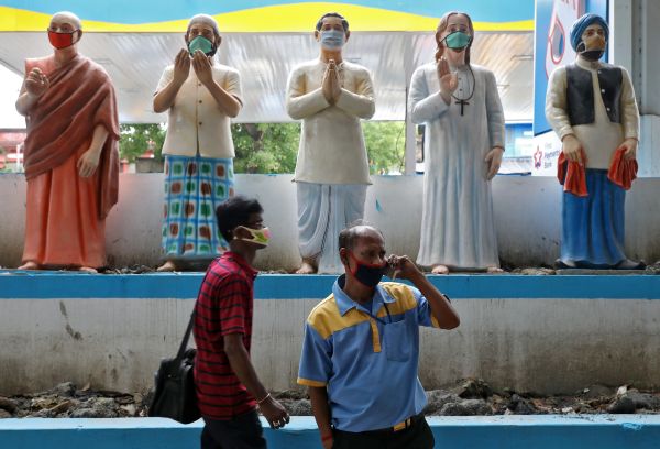 Men wearing protective masks move past the figures with face masks installed outside a fuel station to create awareness about wearing masks to prevent the spreading of the coronavirus disease (COVID-19), in Kol